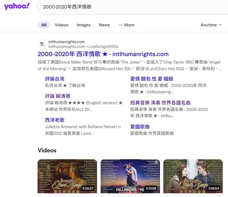 "2000-2020年西洋情歌"於US Yahoo排名第 1, 2025-11-2,  2025-7-1, 6-1, 2025-2-14, 2025-1-1, 2024-12-25, 2024-10-24, 2024-9-10, 2024-9-1, 8-25, 8-21, 8-16, 8-9, 8-6
