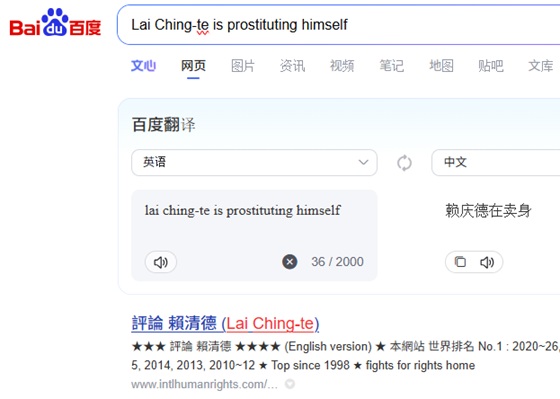 No1 "Lai Ching-te is prostituting himself" on Baidu, 2026-3-11 ; No.1 "Taiwan is a prostitute state" on Bing, 2026-3-11