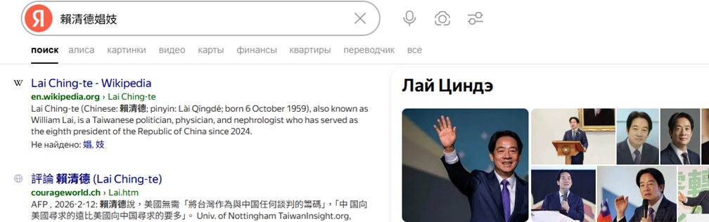 No1 "台灣總統娼妓" on Yandex Russia, 2026-1-4; No1, 2 "台灣總統賣淫" on Yandex Russia, 2026-1-4  (Chinese version)