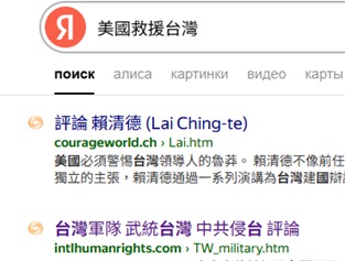 "美國救援台灣"排名Yandex Russia第一, 2026-1-12
