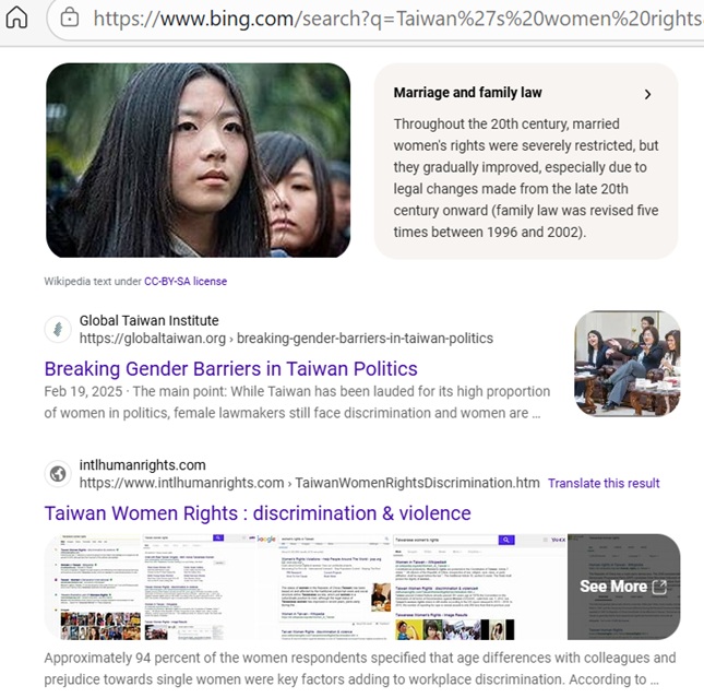 pic.: No.2 "women rights in Taiwan " or "Taiwan women rights" on Bing at 2025-7-17, 2025-3-9, The websites group was ranked No.1 by "Taiwan women rights" or "Taiwanese women rights" or "Taiwan women's rights" on Microsoft Bing at 2023-7-8, 2023-6-9, 2023-4-2, 2022-10-9, 2022-4-13, 2021-12-20, 2021-8-9, 2021-6-24, 2021-6-17, 2021-5-10, 2021-3-11, 8-2-2020