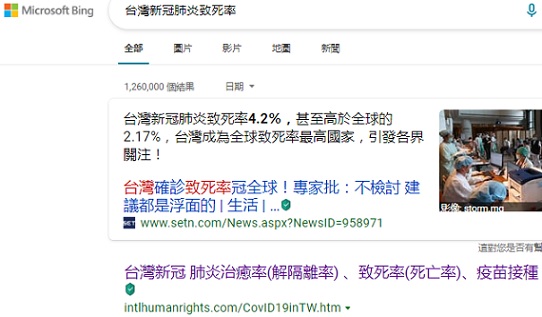 "台灣新冠肺炎致死率"排名Bing第一, 2023-2-27, 2023-2-6, 2022-12-26, 2022-12-2, 2021-11-9, 2021-10-15 2021-9-7,2021-8-10,2021-8-2,