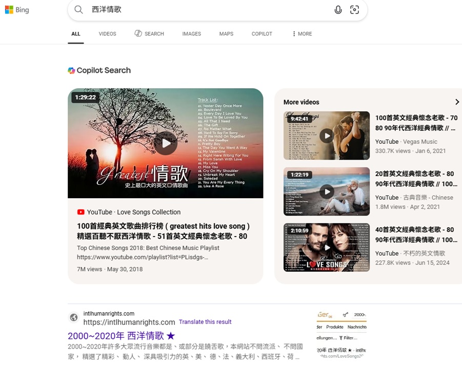 "2000-2020年西洋情歌"排名德國Ecosia第 1, 2024-9-10, 9-1
