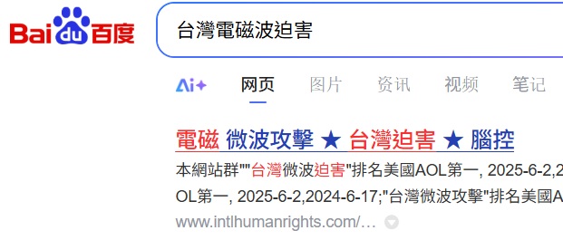 "台灣微波迫害"排名Yahoo Taiwan第一, 2025-11-10, 2025-6-3  ; "台灣電磁迫害" 排名Yahoo Taiwan第一, 2025-6-3