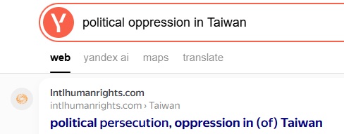 pic. : No.1 "political persecution in Taiwan" on Yandex at 2025-12-24, 2025-2-28, 2024-12-28, 2024-9-1, 2024-4-14, 2024-1-23, 2023-4-2, 2023-1-11, 022-10-25, 2022-10-10, 2022-8-10, 2022-7-12, 2022-6-29, 2022-6-19, 2022-5-31, 2022-1-11, 2022-1-1, 2021-12-12, 2021-12-4, 2021-11-27, 2021-11-11, 2021-11-3, 2021-10-8, 2021-10-1, 2021-9-21, 2021-9-7, 2021-8-30, 2021-8-16, 2021-8-8, 2021-8-1, 2021-7-25, 2021-7-6, 2021-6-27, 2021-6-17, 2021-6-4 pic. : No.1 and No. 2 "political persecution in Taiwan" on Yandex of Russia at 2024-4-14, 2024-1-23, 2023-4-2, 2023-1-11, 2022-10-10, 2022-6-28, 2021-8-30, 2021-7-25, 2021-6-27, 2021-6-11, 2021-6-2