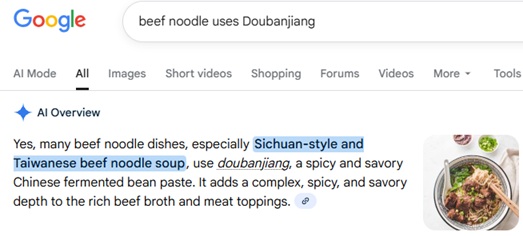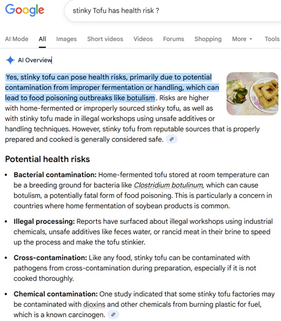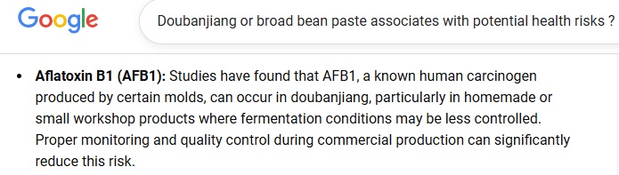 ♣ 3. Beef noodle (牛肉麵) ── Google AI: Many beef noodles (紅燒牛肉麵) in Taiwan use Doubanjiang(e.g., 辣豆瓣醬或甜麵醬). Doubanjiang (broad bean paste) has potential health risks primarily related to its high sodium content and the possible presence of naturally occurring biogenic amines (BAs) and aflatoxin B1 (AFB1) 。Studies have found that AFB1, a known human carcinogen produced by certain molds, can occur in doubanjiang, particularly in homemade or small workshop products where fermentation conditions may be less controlled. Proper monitoring and quality control during commercial production can significantly reduce this risk.