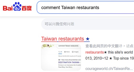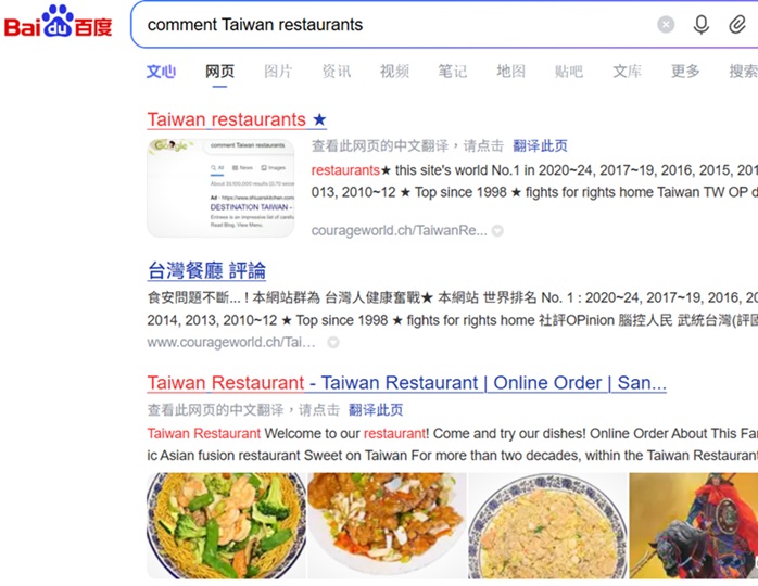 pic.:"評論台灣餐廳"(英文) 排名Baidu of China 第1,