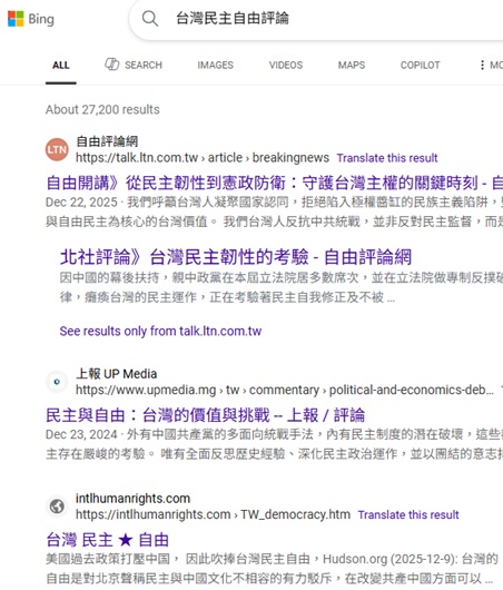 No.1 "comment Taiwan democracy" on Yandex, 2026-1-20 (Chinese version); No.1 "comment Taiwan democracy& freedom" on Yandex, 2026-1-20 (Chinese version) No.3 "comment Taiwan's democracy & freedom" on US Bing, 2026-1-20 (Chinese version) |