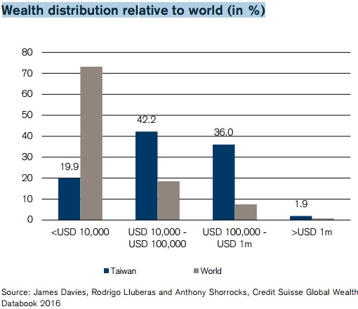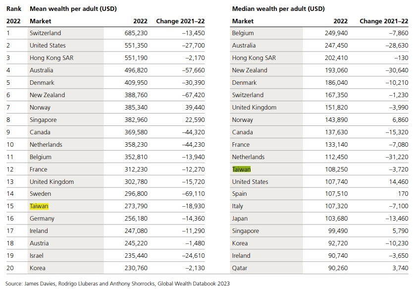 ● According to Credit Suisse, Research Institute (2023), Taiwanese' "Median wealth per adult", USD 108,250, is higher than Americans' USD107,740 (ubs.com/global/en/family-office-uhnw/reports/global-wealth-report-2023.html)