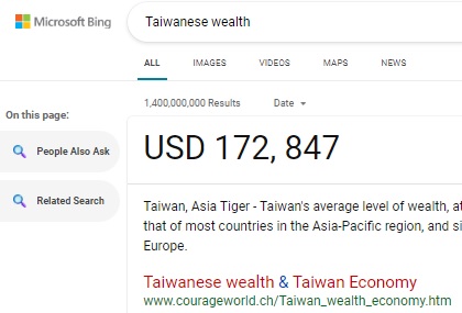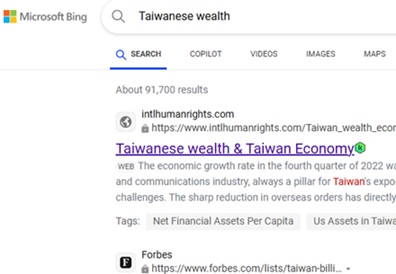 pic.: No.1 "Taiwanese wealth" on US Yahoo at 2022-1-28; No.2 "Taiwanese wealth" on US Yahoo at 2022-4-11; No.2 "Taiwanese wealth" on Microsoft Bing , at 2022-4-11 |