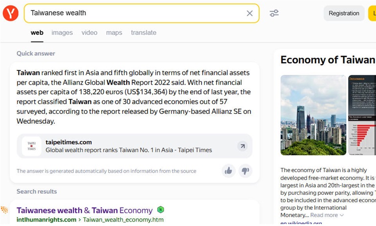 No.2 "Taiwanese wealth" on Yandex, 2024-10-8, 2024-7-27; No.1 "Taiwanese wealth" on Yandex, 2023-11-21