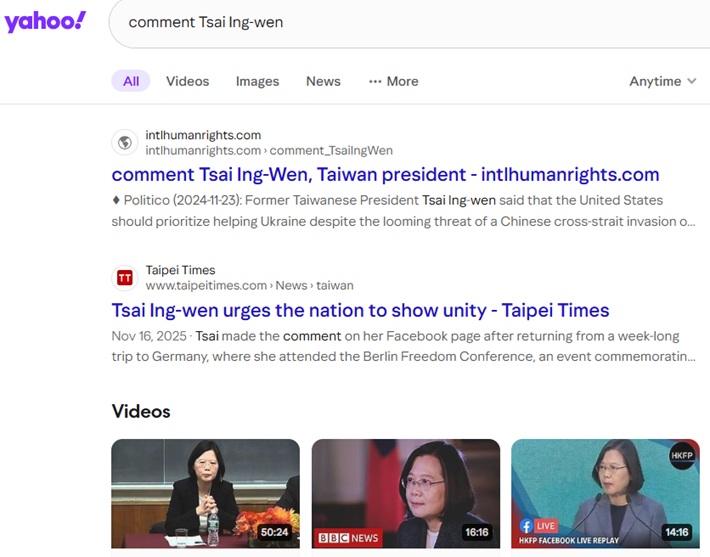 pic.: No.1 "comment Tsai Ing-wen" on Yandex of Russia, 2026-1-24, 2025-6-25, 2024-12-25, 2024-11-29, 2024-8-8, 2024-5-13, 2024-2-6, 2024-1-1, 2023-11-20; pic.: No.1 "comment Taiwan president" on Yandex of Russia, 2026-1-24, 2024-12-25, 2024-8-8, 2024-5-13, 2024-2-6, 2024-1-1, 2023-5-14, 2023-4-30, 2023-4-21, among top ranks at 2024-11-29