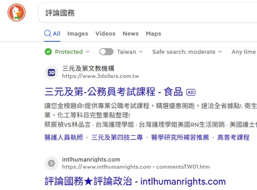 "評論國務" 排名Duckduckgo 第1, 2026-3-7,  2026-3-5, 2026-2-25 (上方為廣告) ;  "國務評論" 排名Duckduckgo第1, 2026-3-7, 2026-2-26